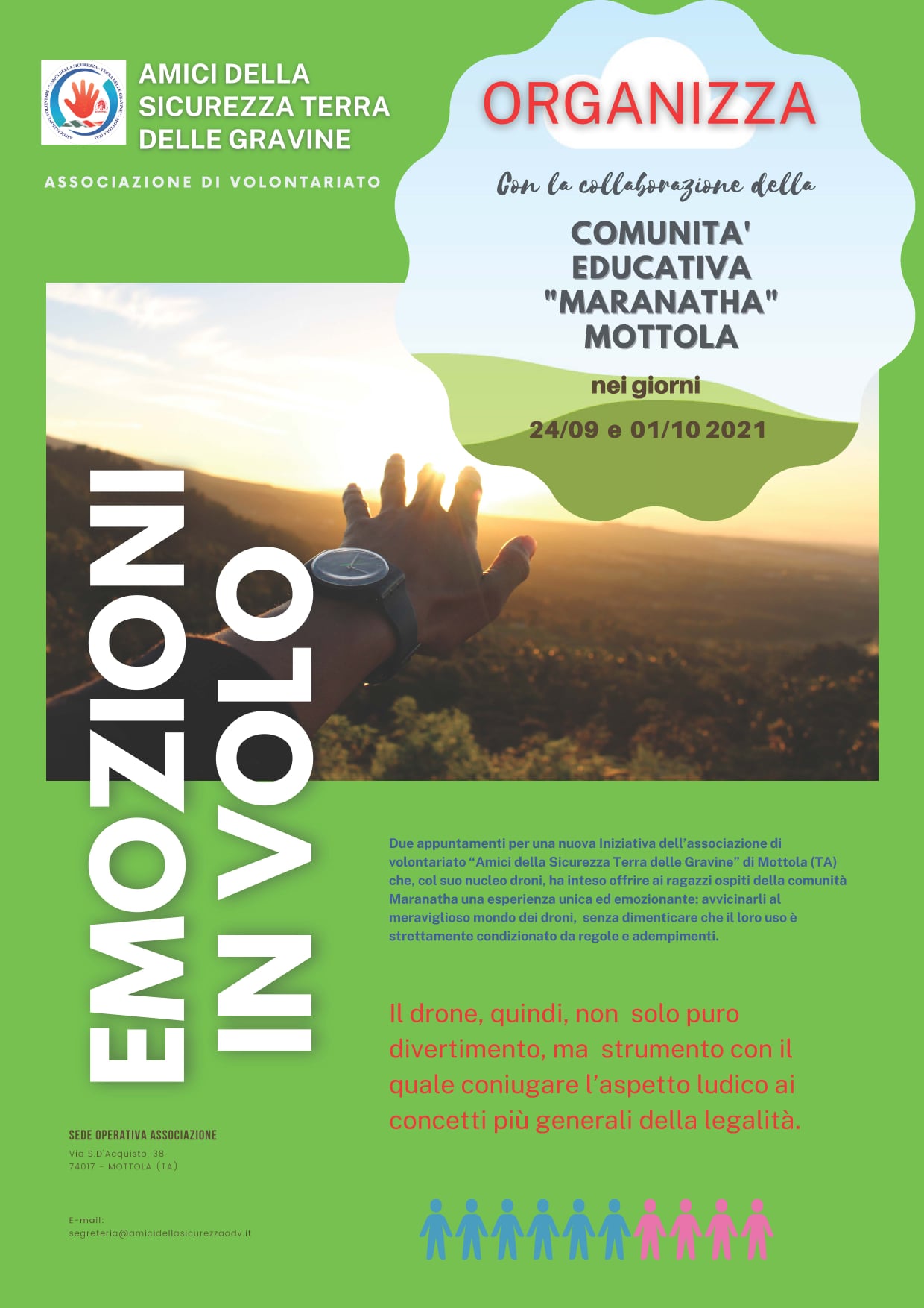 Una nuova iniziativa dell’associazione di volontariato “Amici della Sicurezza Terra delle Gravine” di Mottola (TA) che, con i suoi volontari del nucleo droni, ha inteso offrire ai ragazzi ospiti della Comunità Educativa “Maranatha” una esperienza unica ed emozionante: avvicinarli al meraviglioso mondo dei droni.